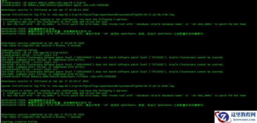 会话日志文件是/u01/app/18.3.0/grid/cfgtoollogs/opatchauto/opatchauto2019-04-26_01-49-56PM.log