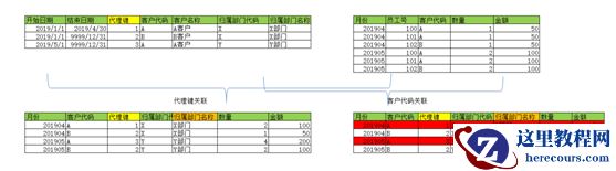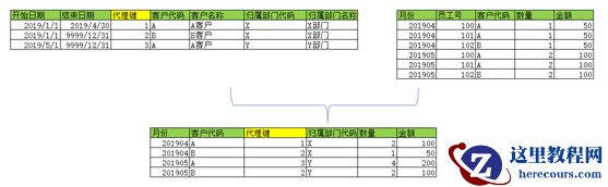 我们通过对客户表的开始日期和结束日期框定每个客户的当前版本,然后落地数据时把客户的代理键带上,这样以后在做数据分析时,如果结果表带的客户维度信息不全,就可以直接用代理键关联客户维表带出需要的维度,如果此时没有代理键做关联,采用客户代码做关联,就会出现数据笛卡尔积,如下图,当我们需要对结果表增加客户的“归属部门名称”时,有“代理键”信息时,则直接按代理键做关联条件带出客户维表里的“归属部门名称”信息,如果按“客户代码”关联,则会导致数据翻倍,见红色数据记录,