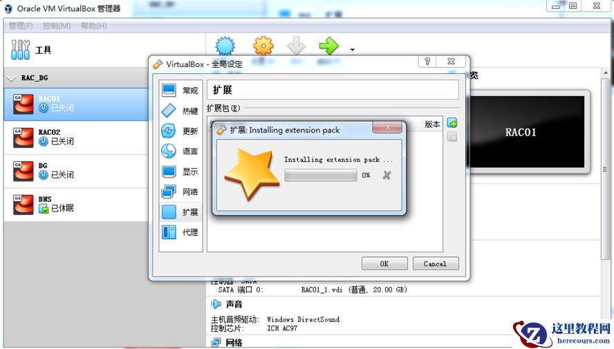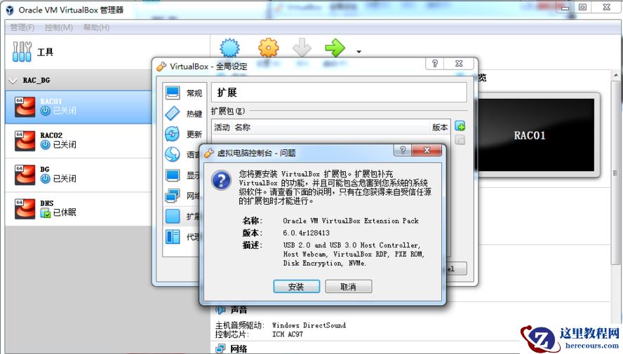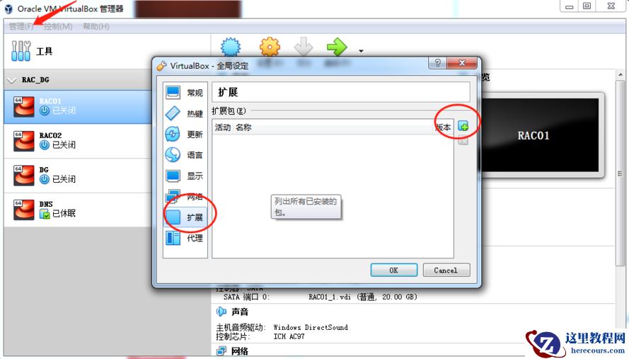 打开安装后的VirtualBox,点击 【管理】【全局设定】,选择【扩展】,添加扩展包后,点击【安装】即可。
