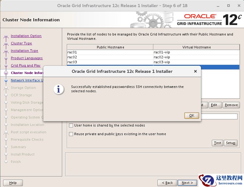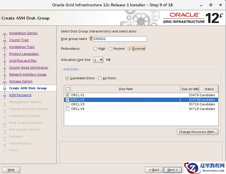 选择外部冗余,选择两块ASM磁盘,作为GRIDDG磁盘组。 这里的空间不能太小,至少6G,不然会报错。