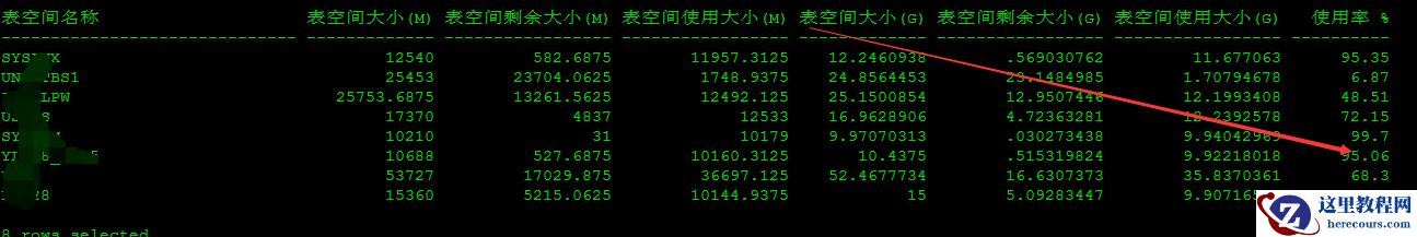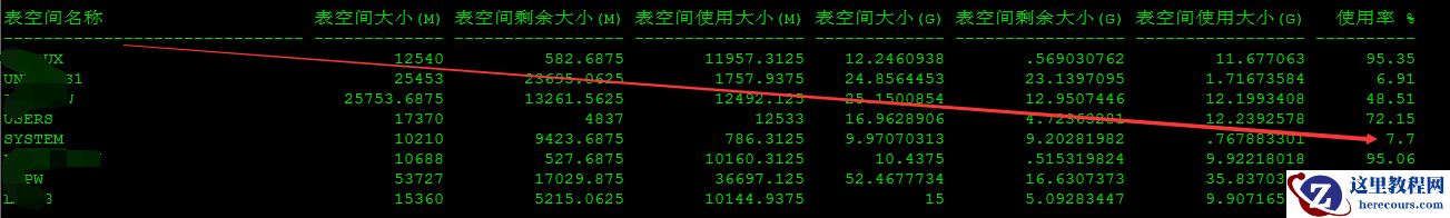 五、再次检查表空间使用率,发现SYSTEM表空间使用率降低为7.7%
