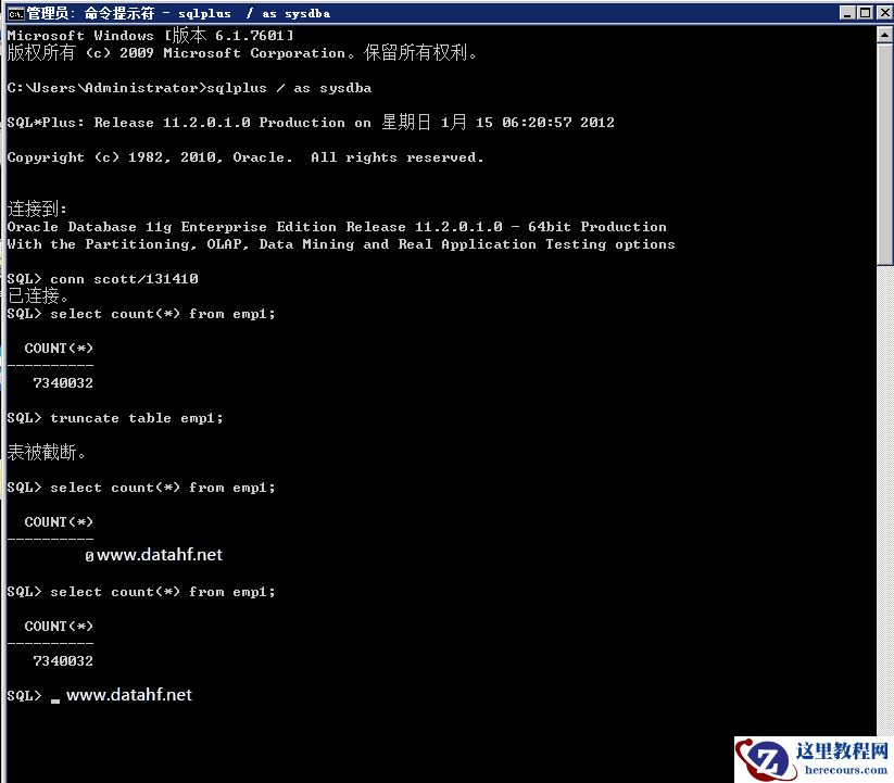 为保护用户数据,本文档构造与客户相同的故障。Scott用户创建表emp1,复制emp表,连续复制多次,总记录数为:7340032条。truncate表emp1,之后没有进行任何操作。查询该表,数据库中该表的记录为0条。
