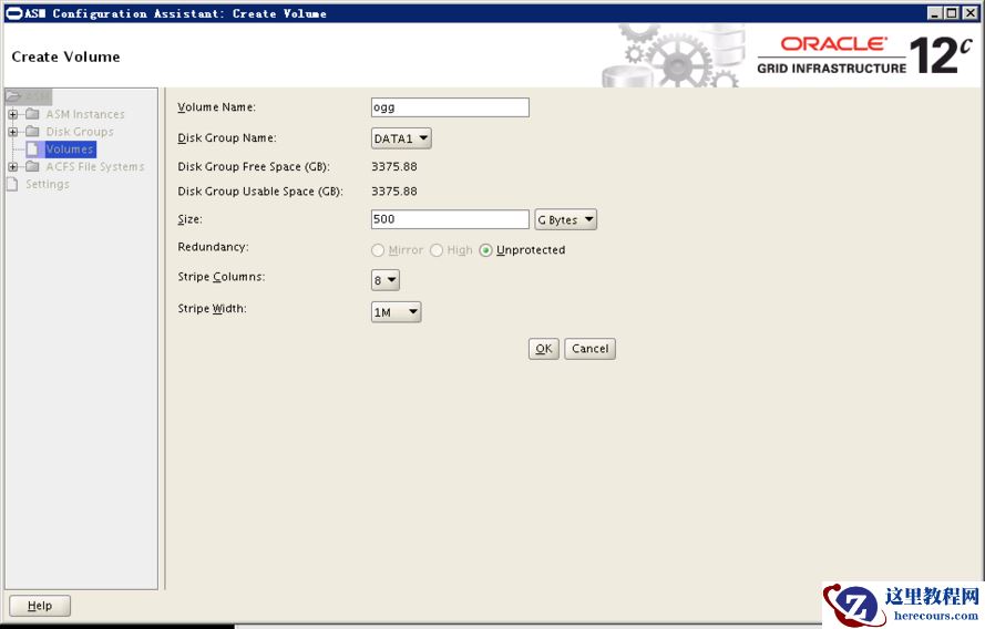 asmca -silent -createvolume -volumeName ogg -volumeDiskGroup DATA1 -volumesizeGB 500