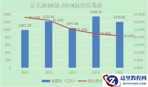 在2019年第一季度,京东总体营收为1210.81亿元人民币,同步增长20.93%。从京东2018年第一季度到2019年第一季度的营收数据环比趋势来看,每年的第二季度和第四季度均有大幅度提高;2018年第一季度京东总体营收1001.28亿元人民币,同比增长33.12%。由此可见,从2018年第一季度同比营收增速开始呈现缓慢下滑趋势。