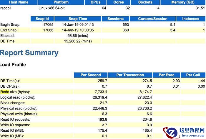 这是一个 11.2.0.4的RAC集群环境,从数据库的概要信息来看,平均每秒仅仅有 7K左右的Redo日志,数据库的物理写也非常低,但是数据库的每秒DB Time却高达259.7 。