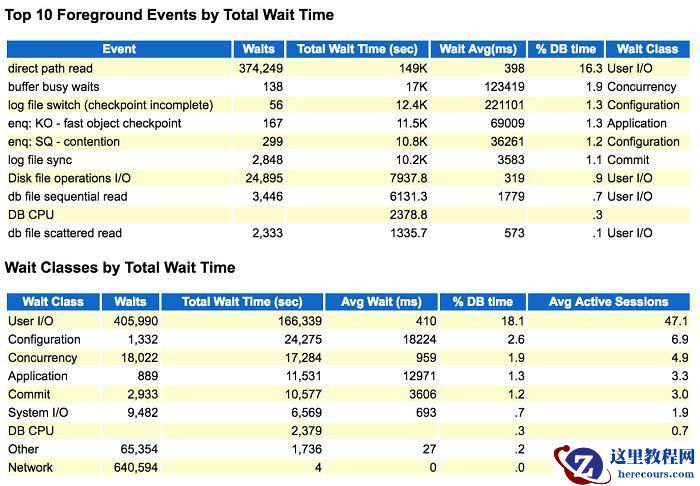进一步的,从 Top Events数据信息中可以看出,整体的 I/O 非常缓慢,User/IO的平均等待时间高达 410毫秒,db file sequential read的平均等待时间也高达 1779毫秒,这说明I/O上出现了明显的瓶颈。
