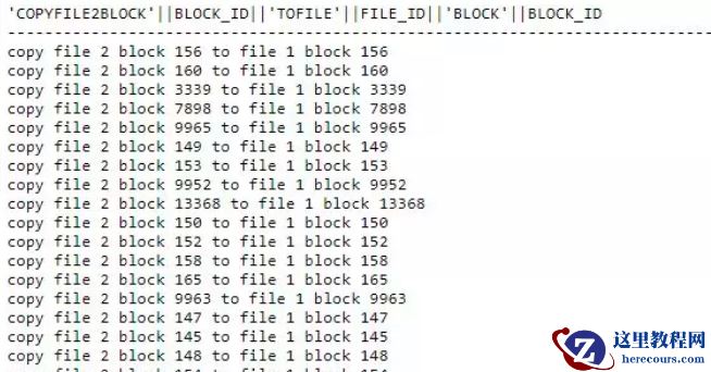 SQL> SELECT DISTINCT'copy file 2 block '||block_id||' to file '||FILE_ID||' block '||BLOCK_ID FROM( 2 SELECTa.OBJ#,TAB#,a.DATAOBJ#,BOBJ#,NAME,DBMS_ROWID.ROWID_RELATIVE_FNO(a.ROWID)FILE_ID,DBMS_ROWID.ROWID_BLOCK_NUMBER(a.ROWID) BLOCK_ID 3 FROMTAB$ a,obj$ b 4 WHEREa.obj#=b.obj# 5 ANDA.OBJ# IN (10,101,103,104,105,118,12939,1297,12973,1300,13003,1302,1304,13059,1306,1307,1309,1314,13273,13298,13604,14,14137,15,16,160,161,17,18,19,192,2,20,21,22,221,225,226,227,228,23,25,252,28,29,294,297,300,301,302,304,307,31,311,32,390,4,433,436,438,446,448,451,453,455,463,5,506,514,515,517,5541,5582,567,5780,5794,5797,5804,5814,587,59,6,61,69,713,7144,717,721,74,8,80,83,86,88,92,95,98,99));