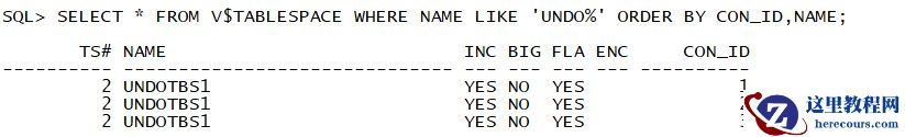 Oracle 19c 中 UNDO 表空间是独立的,CDB 和 每个PDB 都有自己的 UNDO 表空间,因此实际操作跟 11g 是一样的。这里可以看到有3个 UNDOTBS1 表空间,分别属于不同的 CON_ID。
