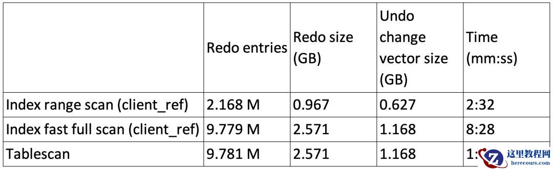 我们再次看到通过适当的索引驱动删除导致redo条目的最小数量和最小undo大小; 然而Tablescan尽管产生了大量更多的undo和redo,但是可以在不到一半的时间内执行; 索引快速全扫描,尽管生成几乎相同的undo和redo数据量,但速度比索引范围扫描慢近3.4倍。