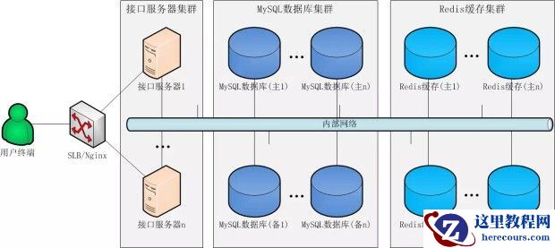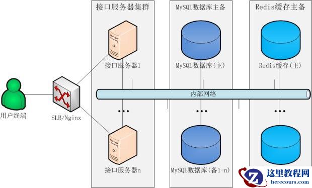 通过SLB/Nginx组成一个负载均衡的接口服务器集群,MySQL数据库和Redis缓存采用了一主一备(或多备)的部署方式。
