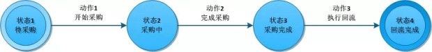 这是一个简易的采购流程,由库管系统发起采购,采购员开始采购,采购员完成采购,同时回流采集订单到库管系统。