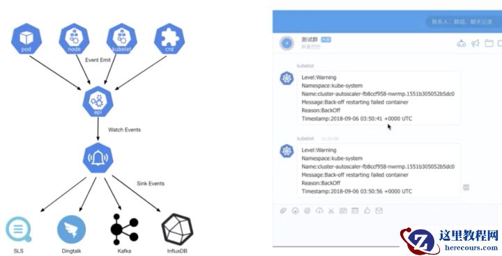 最后,我们给大家介绍一个 K8s 中的事件离线工具叫做 kube-eventer。kube-eventer 是阿里云容器服务开源出的一个组件,它可以将 K8s 里面,类似像 pod eventer、node eventer、核心组件的 eventer、crd 的 eventer 等等一系列的 eventer,通过 API sever 的这个 watch 机制离线到类似像 SLS、Dingtalk、kafka、InfluxDB,然后通过这种离线的机制进行一个时间的审计、监控和告警,我们现在已经把这个项目开源到 GitHub 上了,大家有兴趣的话可以来看一下这个项目。