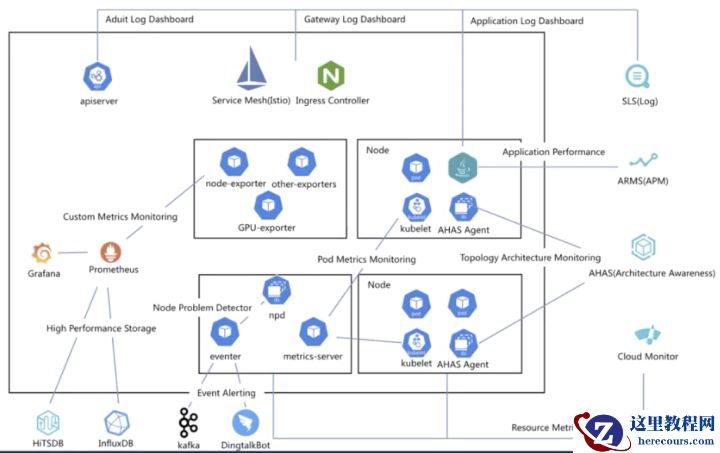 最后是 Cloud Monitor,也就是基础的云监控。它可以采集标准的 Resource Metrics Monitoring,来进行监控数据的一个展现,可以实现 node、pod 等等监控指标的一个展现和告警。