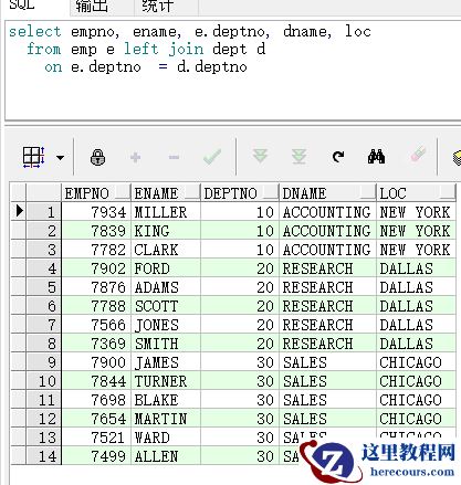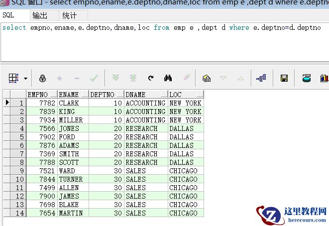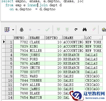 (注意看,deptno字段,因为两个表都有该字段,所以需要显示的指定一个表,如果给表起了别名,则字段前指定表名也需要写表别名)