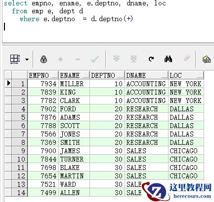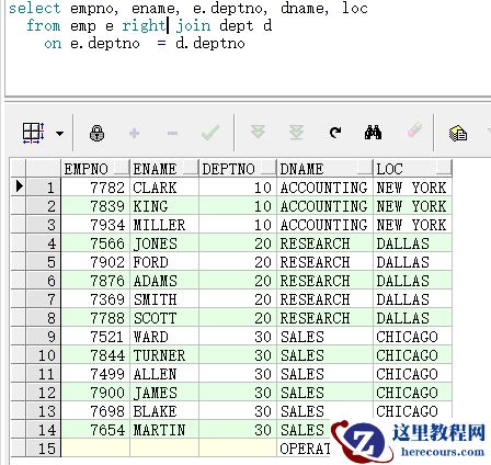 2. 右表的全部信息都会查询出来,左表的信息只有关联上的信息才会查询到,左表没有关联上的信息,则会显示为空,关键词 right join, 也可以用(+)来关联