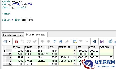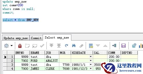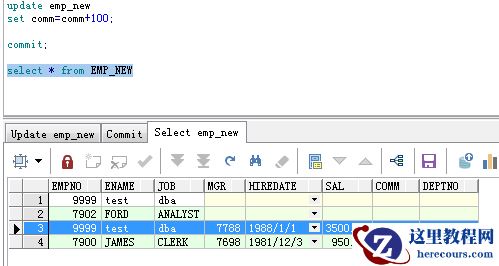 (将所有人的奖金都加100。需要注意的是,由于奖金字段(comm)的类型是数字的,而且值为null,所以数字类型为null值默认不会更新,但是字符格式的不存在这种情况)