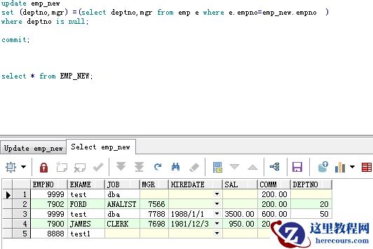 根据emp表中查询得到dept字段和mgr字段结果更新emp_new表中的deptno字段和mgr字段