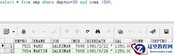 查询雇员表的部门编号为30,并且奖金大于300的结果