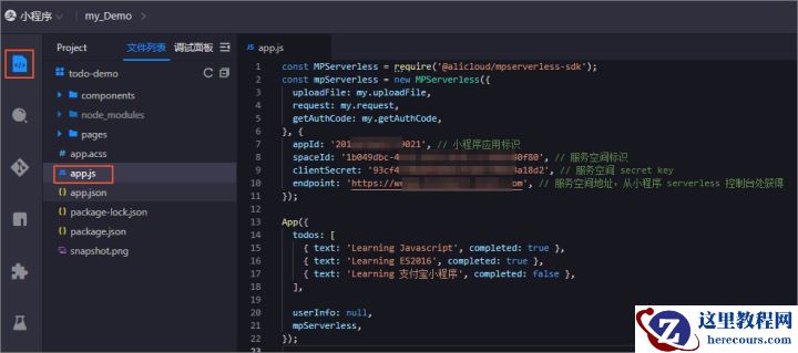 6.在项目文件列表中找到app.js文件,配置以下信息,然后保存。