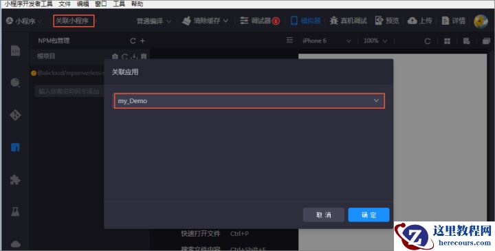 4.在弹出的关联应用对话框中,选择已创建的支付宝小程序,然后单击