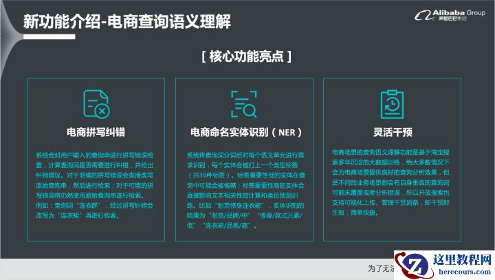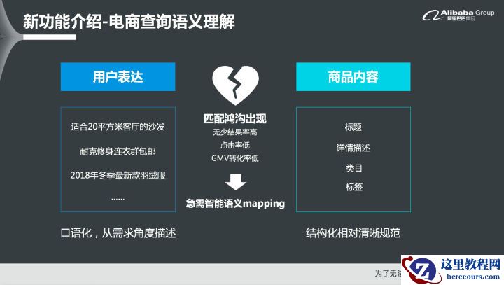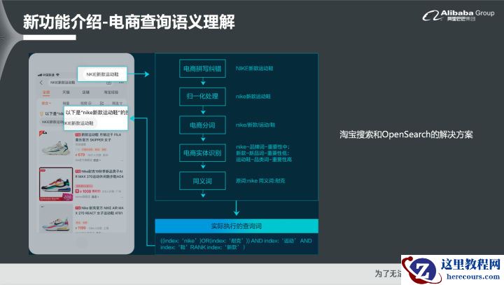 淘宝主要算法功能原生集成:OpenSearch不仅基于了阿里巴巴自主研发的大规模分布式搜索引擎,其在搜索引擎之上还集成了业界领先的淘系算法功能,包括了电商领域的语义查询与理解、排序等,借助这些算法能力就能够助力GMV转化率、CTR等业务指标的快速提升。无需开发就能实现索引秒级更新:OpenSearch支持与云上的RDS和PolarDB两个数据库无缝对接。在OpenSearch的控制台只需要配置几个关键参数,比如数据库名、用户名以及密码就可以直接对接数据库和OpenSearch,实现数据实时更新,整个过程非常简单,无需任何开发。0运维,免部署:OpenSearch是云端全托管服务,因此无需运维和部署,非常方便。服务搭建更简单:开发者无需了解OpenSearch复杂的原理,就能够快速上手使用,并将关键路径流程化、可视化出来,仅需要几步就能够完成基础服务的搭建。如果业务经常会出现波峰波谷情况,比如618或者双11大促,都可以在OpenSearch上随时扩缩容,并且能够及时生效,无需提前申请配额,因此也非常方便。二、新功能介绍-电商查询语义理解首先为大家介绍OpenSearch的电商查询语义理解这个新功能。之所以要实现电商查询语义理解这个功能,是因为在电商场景里面,搜索引导的成交往往占比达到60%以上,因此电商对于搜索的精准度要求非常严格。但是在实际的搜索场景中,用户输入的关键词往往非常口语化,而站内商品的标题、详情描述、类目以及标签等都属于比较书面化和规范化的文本,因此就导致查询词和商品信息无法匹配。如果站点没有实现语义的Mapping,用户往往搜不到其想要的商品,对于平台而言,这就使得无结果率或者少结果率都会非常高。基于上述的背景,OpenSearch就把淘宝搜索内部的智能语义Mapping功能集成到了OpenSearch内部,称之为查询语义理解,该功能专门为电商领域提供服务,因此垂直性也非常强。