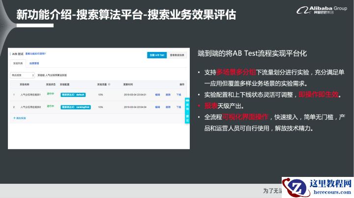 对于OpenSearch而言,其无法支持第一种线下人工评估,因此用户只能自己抽取Query来进行人工评估。当人工评估完成之后,OpenSearch可以支持线上的AB Test端到端一键配置,可以支持多场景多分组下流量划分进行试验,充分满足了单一应用但覆盖多样业务场景的实验需求。并且使得实验配置和上下线状态可以灵活调整,即操作即生效。并且可以实现报表的天级产出,帮助客户进行决策。并且能够实现全流程可视化界面操作,能够使得用户实现快速接入,简单无门槛,并且产品和运营人员也可以直接使用。