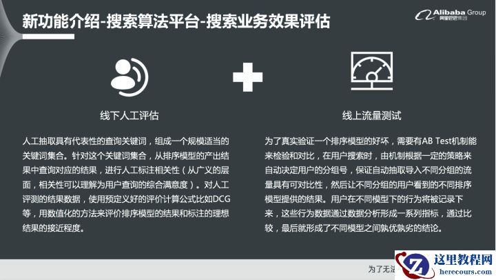 搜索业务效果评估将模型应用到排序表达式中之后就需要对于搜索业务效果进行评估了,传统方式往往是结合线下人工评估和线上流量测试。线下人工评估往往会抽取一些具有代表性的查询关键词,组成一个规模适当的关键词集合。针对这个关键词集合,从排序模型的产出结果中查询对应的结果,进行人工标注相关性。对人工评测的结果数据,使用预定义好的评价计算公式比如DCG等,用数值化的方法来评价模型的结果和标注的理想结果的接近程度。如果人工评估认为搜索业务的效果是变好的,此时就可以进行线上流量测试。为了真实验证一个排序模型的好坏,就需要使用刚才提到的AB Test机制来检验和对比。在用户搜索时,由测试机制根据一定的策略来自动决定用户的分组号,保证自动抽取导入不同分组的流量具有可对比性,然后让不同分组的用户看到的不同排序模型所提供的结果,用户在不同模型下的行为将被记录下来,这些行为数据通过数据分析形成一系列指标,通过比较,最后就形成了不同模型之间孰优孰劣的结论。