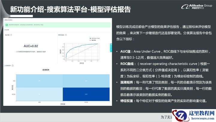 模型评估报告OpenSearch会针在每个模型在训练完成后自动产出一个模型评估报告,通过这个质量来评估模型的效果,比如分类算法模型的评估报告中就会包括以下指标,比如整个模型是否适合在业务中使用,此外还有一些细化的指标如AUC值、ROC曲线、混淆矩阵、特征权重等。对于一些有算法经验的同学也可以直接通过这些指标值来发现问题,并进行模型的下一轮调优。