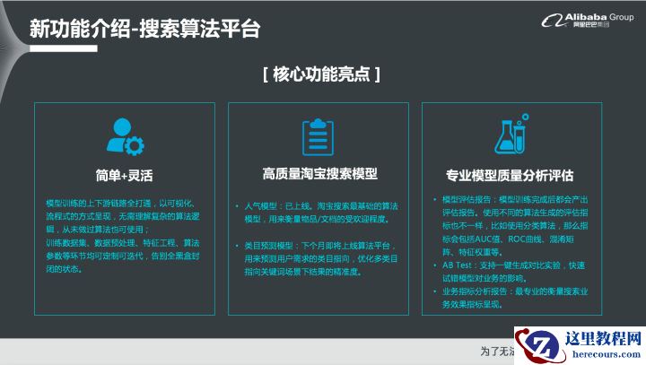 基于以上两个令人极为头疼的问题,OpenSearch通过一个高可视化的方式来支持用户直接完成数据预处理、特征工程、算法调参、模型评估、模型管理模型上线等一系列繁杂的算法日常工作,并且还集成了阿里巴巴集团内部比较成熟的排序算法模型。用户可以通过整个算法平台自行训练高质量的算法排序模型并且应用到OpenSearch的算法排序中,之后将模型上线到实际业务并进行AB Test对比,得到整体实验效果并且回收,实现全链路OpenSearch的完全打通,并且以可视化、流程式地进行呈现。对于没有接触过这些算法的开发者而言,也可以直接上手这个OpenSearch平台。并且该平台专注于搜索算法模型训练,因此会内置一些阿里巴巴集团已经经过多年实战经验沉淀下来的模型,比如比较成熟的人气模型。并且在未来,类目预测等模型也会陆续上线到OpenSearch平台上。总之,用户可以在平台上完成整个算法模型训练以及上下游的流程。