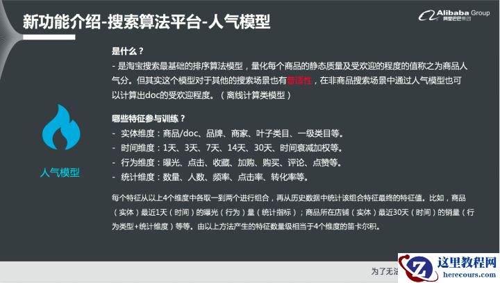 此外,对于上线的模型是否优秀而言,平台还会产出一个较为专业的评估报告,通过这些评估报告和指标使得模型的效果可以一目了然。对于模型上线之后用户是否买单而言,OpenSearch还支持一键生成对比AB Test实验,能够支持用户快速迭代模型和改善效果。对于模型上线效果的回归而言,平台还能提供业务指标分析的报表。人气模型人气模型简单而言就是衡量用户对于站内每个商品或者每个文件的受欢迎程度,也就是静态质量分数。可以将其加入排序,使其成为排序的一个因子,通过这个因子来直接影响排序效果。OpenSearch会将四个维度的特征加入训练,包括了实体维度、时间维度、行为维度以及统计维度。