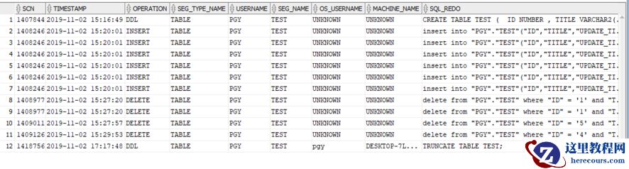 FROM LOG_MNR_TAB WHERE TABLE_NAME='TEST' ORDER BY SCN;