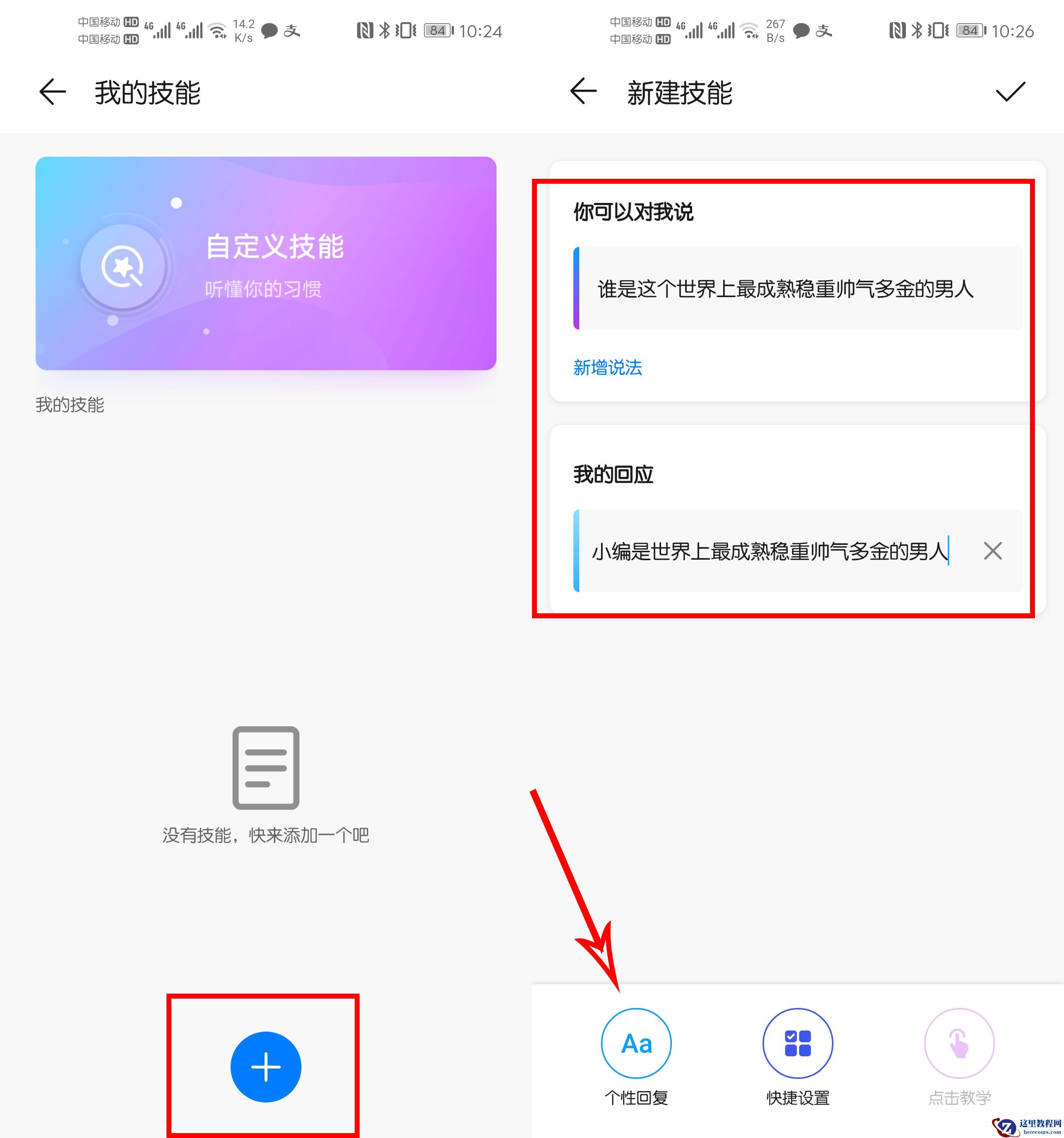 3. 自定义技能什么是自定义技能呢?简单的来说,就是对小艺进行设置!在【个性回复】内设置一些自己想听到的回复短语!比如:当小艺听到"谁是这个世界上最成熟稳重、帅气多金的男人?"这句话的时候,就可以设置小艺的回复短语"小编就是世界上最成熟稳重、帅气多金的男人。"