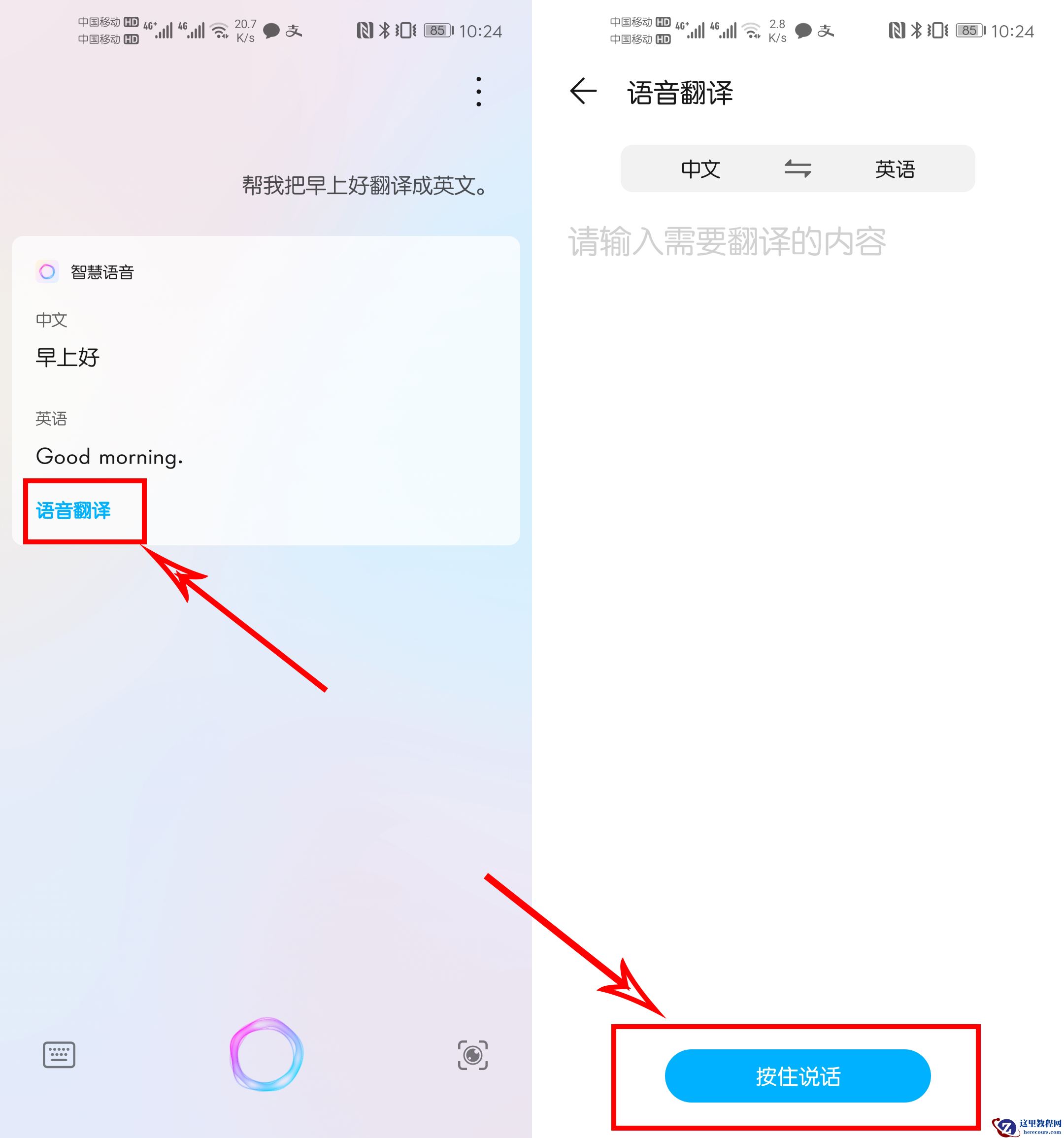 2. 语音翻译华为手机用户可以通过小艺与外国人进行友好的交流,完全不用担心自己的外语水平差的问题。直接对着小艺说"语音翻译",然后再对着小艺说中文语音,小艺就会帮我们翻译成英文。