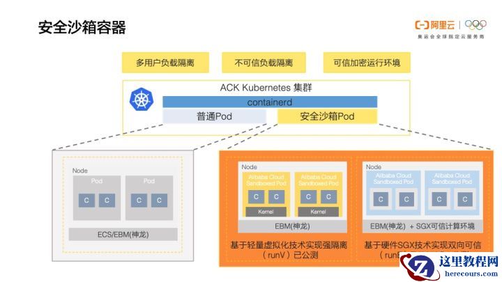 在阿里云 Kubernetes 服务 ACK,我们已经采用 containerd 作为容器运行时管理,来支撑安全沙箱容器和 runc 容器的混合部署。在现有产品中,我们和阿里云操作系统团队、蚂蚁金服一起支持了基于轻量虚拟化的 runV 沙箱容器,4Q 也将和操作系统团队、安全团队合作发布基于 Intel SGX 的可信加密沙箱容器。