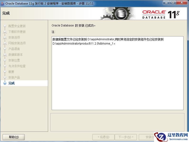 3.8 等待进度完成会弹出完成的对话框,就代表我们的oracle软件安装完成