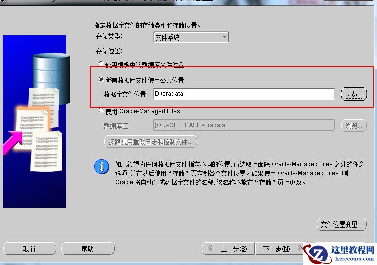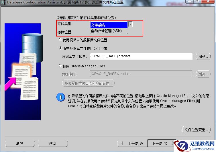 默认是在文件系统中,也就是我们的操作系统,当然如果你服务器上要是有ASM磁盘组或者你创建集群数据库的话,就必须选择ASM了。但是我这是单击安装,所以就选择文件系统了