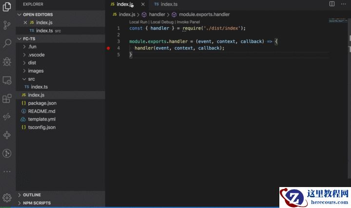 4. 本地调试与部署 本地调试 在 index.js 以及 src/index.ts 文件中插入一些断点。 点击 VSCode 左侧栏目中的函数计算图标,展开本地资源树 点击函数名右侧的调试按钮,即可调试 ts 源代码。![]()