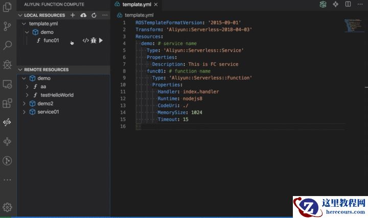 在项目根目录新建 index.js 文件,文件内容如下: const { handler } = require('./dist/index'); module.exports.handler = (event, context, callback) => { handler(event, context, callback); } 这里又定义了一个 handler 方法,该方法中调用了编译后 js 文件中的 handler 方法。 在项目根目录新建 template.yml 文件,文件内容如下: ROSTemplateFormatVersion: '2015-09-01' Transform: 'Aliyun::Serverless-2018-04-03' Resources: demo: # service name Type: 'Aliyun::Serverless::Service' Properties: Description: This is FC service func01: # function name Type: 'Aliyun::Serverless::Function' Properties: Handler: index.handler Runtime: nodejs8 CodeUri: ./ MemorySize: 1024 Timeout: 15 该文件中对我们的资源(即函数计算中的服务以及函数)进行了定义,具体内容可以参考: Fun 规范文档。 如果安装了 Serverless VSCode 插件,那么可以尝试下插件的智能提示,效果如图: