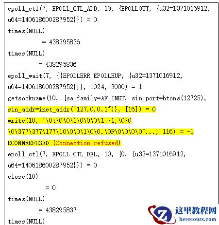在以上lreg进程活动的日志可以看出 较多的 epoll_ctl与 epoll_wait函数调用,epoll在这里epoll貌似一种不断来触发监听并操作某些文件描述的过程,lreg调用 epoll_wait 每3秒来监测监听进程是否启动,当发生注册时使用 epoll_ctl去添加删除某个文件描述符。具体的确实一时 无法 了解清楚。