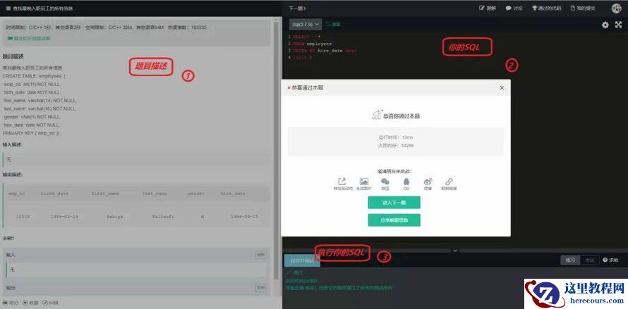 左边是题目,右边编辑 SQL, 点击【保存并调试】即可运行 SQL。系统会提示,你的答案是否通过!
