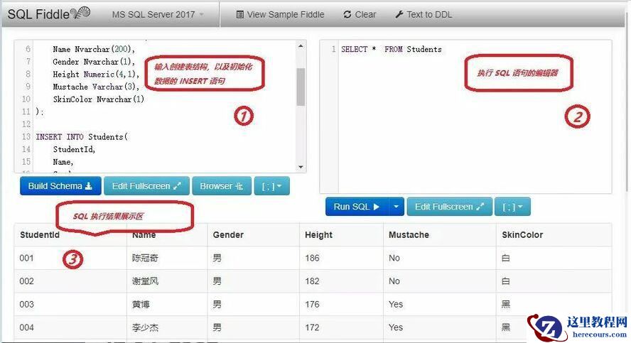 区域 1 的编辑器用来创建数据库 schema ,比如建表,新建数据;