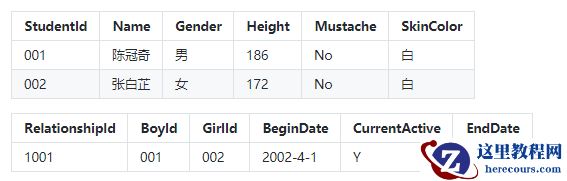 这里用到的花名册,恋爱关系秘本就是数据库里的二维表。先建这两张表,分别是 Students(花名册表),Relationships(恋爱关系秘本)。为了更加形象,用 Excel 展示下,这两张表分别长这个样子: