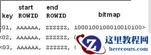 在oracle中是根据rowid来定位记录的,因此,我们需要引入start rowid和end rowid,通过start rowid ,end rowid 和二进制位的偏移,我们就可以非常快速的计算出二进制位所代表的表记录rowid。位图索引的最终逻辑结构如下图: