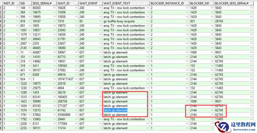 通过数据库的视图gv$session_blockers 查看阻塞情况, 结果发现有两个会话持有的gc element 的latch 阻塞了大量的会话: