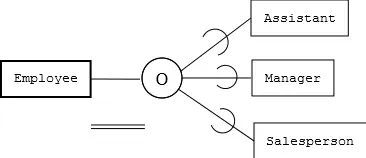 "O" is overlapping, meaning there could be overlapping between each subclass entities. (A manager could also be a salesperson) Besides, we can use "D" for disjoint subclasses.A single line between Employee and its subclasses implies an optinal participation (an employee may not belong to any subclass), while a double line implies a mandatory participation (an employee must be in one or more subclasses).An U-like symbol identify subclasses by pointing to them. (the entity the bottom of "U" points to is a subclass)