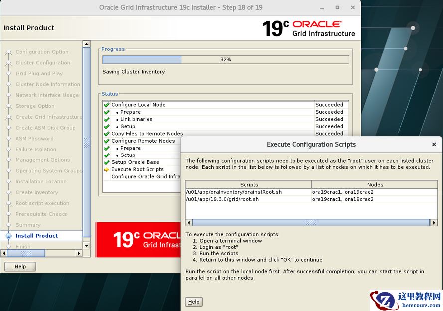 [root@ora19crac1 ~]# /u01/app/oraInventory/orainstRoot.sh Changing permissions of /u01/app/oraInventory. Adding read,write permissions for group. Removing read,write,execute permissions for world. Changing groupname of /u01/app/oraInventory to oinstall. The execution of the script is complete. [root@ora19crac1 ~]# /u01/app/19.3.0/grid/root.sh Performing root user operation. The following environment variables are set as: ORACLE_OWNER= grid ORACLE_HOME= /u01/app/19.3.0/grid Enter the full pathname of the local bin directory: [/usr/local/bin]: Copying dbhome to /usr/local/bin ... Copying oraenv to /usr/local/bin ... Copying coraenv to /usr/local/bin ... Creating /etc/oratab file... Entries will be added to the /etc/oratab file as needed by Database Configuration Assistant when a database is created Finished running generic part of root script. Now product-specific root actions will be performed. Relinking oracle with rac_on option Using configuration parameter file: /u01/app/19.3.0/grid/crs/install/crsconfig_params The log of current session can be found at: /u01/app/grid/crsdata/ora19crac1/crsconfig/rootcrs_ora19crac1_2020-03-01_00-27-15AM.log 2020/03/01 00:27:27 CLSRSC-594: Executing installation step 1 of 19: 'SetupTFA'. 2020/03/01 00:27:27 CLSRSC-594: Executing installation step 2 of 19: 'ValidateEnv'. 2020/03/01 00:27:27 CLSRSC-363: User ignored prerequisites during installation 2020/03/01 00:27:27 CLSRSC-594: Executing installation step 3 of 19: 'CheckFirstNode'. 2020/03/01 00:27:32 CLSRSC-594: Executing installation step 4 of 19: 'GenSiteGUIDs'. 2020/03/01 00:27:33 CLSRSC-594: Executing installation step 5 of 19: 'SetupOSD'. 2020/03/01 00:27:33 CLSRSC-594: Executing installation step 6 of 19: 'CheckCRSConfig'. 2020/03/01 00:27:34 CLSRSC-594: Executing installation step 7 of 19: 'SetupLocalGPNP'. 2020/03/01 00:28:11 CLSRSC-594: Executing installation step 8 of 19: 'CreateRootCert'. 2020/03/01 00:28:12 CLSRSC-4002: Successfully installed Oracle Trace File Analyzer (TFA) Collector. 2020/03/01 00:28:16 CLSRSC-594: Executing installation step 9 of 19: 'ConfigOLR'. 2020/03/01 00:28:31 CLSRSC-594: Executing installation step 10 of 19: 'ConfigCHMOS'. 2020/03/01 00:28:31 CLSRSC-594: Executing installation step 11 of 19: 'CreateOHASD'. 2020/03/01 00:28:37 CLSRSC-594: Executing installation step 12 of 19: 'ConfigOHASD'. 2020/03/01 00:28:37 CLSRSC-330: Adding Clusterware entries to file 'oracle-ohasd.service' 2020/03/01 00:30:02 CLSRSC-594: Executing installation step 13 of 19: 'InstallAFD'. 2020/03/01 00:31:08 CLSRSC-594: Executing installation step 14 of 19: 'InstallACFS'. 2020/03/01 00:32:18 CLSRSC-594: Executing installation step 15 of 19: 'InstallKA'. 2020/03/01 00:32:24 CLSRSC-594: Executing installation step 16 of 19: 'InitConfig'. [INFO] [DBT-30161] Disk label(s) created successfully. Check /u01/app/grid/cfgtoollogs/asmca/asmca-200301AM123258.log for details. 2020/03/01 00:39:40 CLSRSC-482: Running command: '/u01/app/19.3.0/grid/bin/ocrconfig -upgrade grid oinstall' CRS-4256: Updating the profile Successful addition of voting disk cbcea46f7b764fccbfd884da8c453995. Successful addition of voting disk e8c22109d62c4fb9bfd3f3e3e36413c8. Successful addition of voting disk 67f8dc6671954fe9bf7b802eeb63f8ca. Successfully replaced voting disk group with +OCR_VOT_GP1. CRS-4256: Updating the profile CRS-4266: Voting file(s) successfully replaced ## STATE File Universal Id File Name Disk group -- ----- ----------------- --------- --------- 1. ONLINE cbcea46f7b764fccbfd884da8c453995 (AFD:OCR_VOT_GP11) [OCR_VOT_GP1] 2. ONLINE e8c22109d62c4fb9bfd3f3e3e36413c8 (AFD:OCR_VOT_GP12) [OCR_VOT_GP1] 3. ONLINE 67f8dc6671954fe9bf7b802eeb63f8ca (AFD:OCR_VOT_GP13) [OCR_VOT_GP1] Located 3 voting disk(s). 2020/03/01 00:41:33 CLSRSC-594: Executing installation step 17 of 19: 'StartCluster'. 2020/03/01 00:47:10 CLSRSC-343: Successfully started Oracle Clusterware stack 2020/03/01 00:47:10 CLSRSC-594: Executing installation step 18 of 19: 'ConfigNode'. 2020/03/01 01:11:14 CLSRSC-594: Executing installation step 19 of 19: 'PostConfig'. 2020/03/01 01:12:47 CLSRSC-325: Configure Oracle Grid Infrastructure for a Cluster ... succeeded