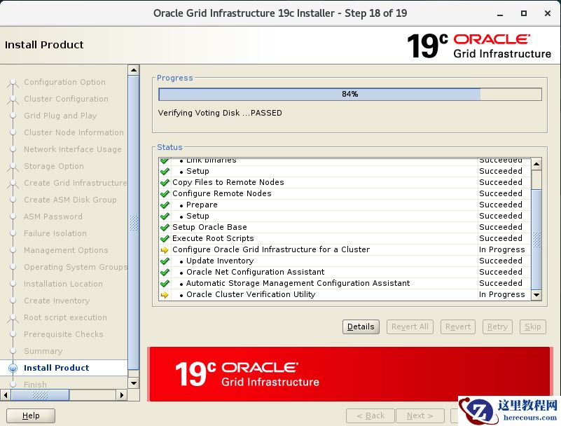 [root@ora19crac2 ~]# /u01/app/oraInventory/orainstRoot.sh Changing permissions of /u01/app/oraInventory. Adding read,write permissions for group. Removing read,write,execute permissions for world. Changing groupname of /u01/app/oraInventory to oinstall. The execution of the script is complete. [root@ora19crac1 ~]# /u01/app/19.3.0/grid/root.sh [root@ora19crac2 ~]# /u01/app/19.3.0/grid/root.sh Performing root user operation. The following environment variables are set as: ORACLE_OWNER= grid ORACLE_HOME= /u01/app/19.3.0/grid Enter the full pathname of the local bin directory: [/usr/local/bin]: Copying dbhome to /usr/local/bin ... Copying oraenv to /usr/local/bin ... Copying coraenv to /usr/local/bin ... Creating /etc/oratab file... Entries will be added to the /etc/oratab file as needed by Database Configuration Assistant when a database is created Finished running generic part of root script. Now product-specific root actions will be performed. Relinking oracle with rac_on option Using configuration parameter file: /u01/app/19.3.0/grid/crs/install/crsconfig_params The log of current session can be found at: /u01/app/grid/crsdata/ora19crac2/crsconfig/rootcrs_ora19crac2_2020-03-01_01-17-59AM.log 2020/03/01 01:18:05 CLSRSC-594: Executing installation step 1 of 19: 'SetupTFA'. 2020/03/01 01:18:05 CLSRSC-594: Executing installation step 2 of 19: 'ValidateEnv'. 2020/03/01 01:18:05 CLSRSC-363: User ignored prerequisites during installation 2020/03/01 01:18:05 CLSRSC-594: Executing installation step 3 of 19: 'CheckFirstNode'. 2020/03/01 01:18:08 CLSRSC-594: Executing installation step 4 of 19: 'GenSiteGUIDs'. 2020/03/01 01:18:08 CLSRSC-594: Executing installation step 5 of 19: 'SetupOSD'. 2020/03/01 01:18:08 CLSRSC-594: Executing installation step 6 of 19: 'CheckCRSConfig'. 2020/03/01 01:18:09 CLSRSC-594: Executing installation step 7 of 19: 'SetupLocalGPNP'. 2020/03/01 01:18:12 CLSRSC-594: Executing installation step 8 of 19: 'CreateRootCert'. 2020/03/01 01:18:12 CLSRSC-594: Executing installation step 9 of 19: 'ConfigOLR'. 2020/03/01 01:18:23 CLSRSC-594: Executing installation step 10 of 19: 'ConfigCHMOS'. 2020/03/01 01:18:24 CLSRSC-594: Executing installation step 11 of 19: 'CreateOHASD'. 2020/03/01 01:18:27 CLSRSC-594: Executing installation step 12 of 19: 'ConfigOHASD'. 2020/03/01 01:18:28 CLSRSC-330: Adding Clusterware entries to file 'oracle-ohasd.service' 2020/03/01 01:18:44 CLSRSC-4002: Successfully installed Oracle Trace File Analyzer (TFA) Collector. 2020/03/01 01:19:54 CLSRSC-594: Executing installation step 13 of 19: 'InstallAFD'. 2020/03/01 01:20:57 CLSRSC-594: Executing installation step 14 of 19: 'InstallACFS'. 2020/03/01 01:22:23 CLSRSC-594: Executing installation step 15 of 19: 'InstallKA'. 2020/03/01 01:22:25 CLSRSC-594: Executing installation step 16 of 19: 'InitConfig'. 2020/03/01 01:22:36 CLSRSC-594: Executing installation step 17 of 19: 'StartCluster'. 2020/03/01 01:23:45 CLSRSC-343: Successfully started Oracle Clusterware stack 2020/03/01 01:23:45 CLSRSC-594: Executing installation step 18 of 19: 'ConfigNode'. 2020/03/01 01:24:21 CLSRSC-594: Executing installation step 19 of 19: 'PostConfig'. 2020/03/01 01:25:03 CLSRSC-325: Configure Oracle Grid Infrastructure for a Cluster ... succeeded Error 4 opening dom ASM/Self in 0xb2ac810 Domain name to open is ASM/Self Error 4 opening dom ASM/Self in 0xb2ac810
