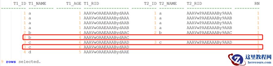 由于之前是只对t1的rowid进行分组,因此对于满足条件的记录也无法取到,因此考虑根据t1的rowid和t2的rowid共同进行分组,这样也可以唯一确定一行记录,同时取出第一行记录则达到了去重。