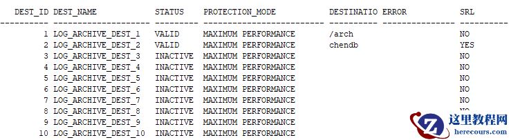 SQL> SELECT DEST_ID, DEST_NAME, STATUS, PROTECTION_MODE, DESTINATION,ERROR,SRL FROM V$ARCHIVE_DEST_STATUS;