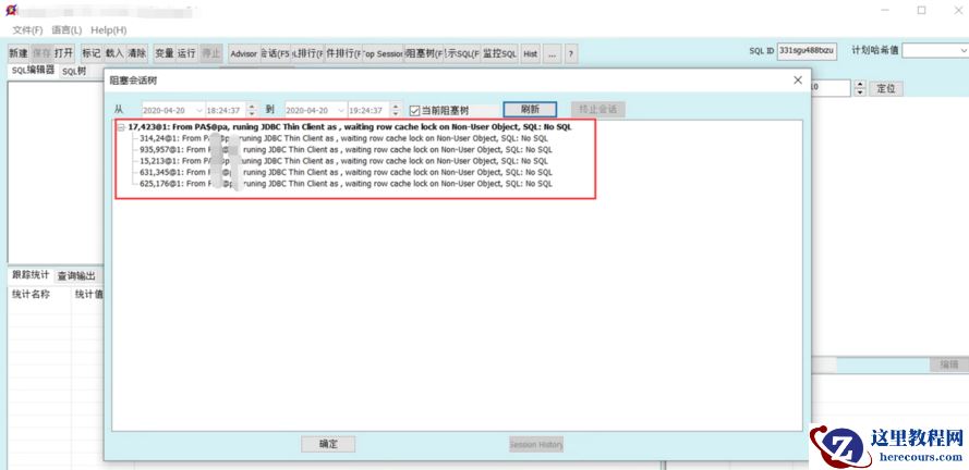 出现 session lock ,通过主界面的“阻塞树”,可以查看 session 阻塞的情况。